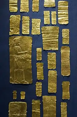 A stylized birds-head ornament can be recognised, like the finely-decorated scabbard of "Median" shape, as very similar to that of a soldier from a Persepolis relief, where it forms the crest to his bow-case.[19] These seem to be the only items relating to weapons, though other pieces may have decorated horse harness.[20] Another group of plaques were probably bracteates intended to be sewn onto clothing through the small holes round their edges. These have a variety of motifs, including the face of the Egyptian dwarf-god Bes, lion-griffins, a sphinx, and a cut-out figure apparently showing a king (see illustration below; Bes is centre in the top row, the king at bottom right).[21]