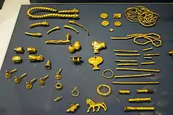 The Oxus treasure (Persian: گنجینه آمودریا) is a collection of about 180 surviving pieces of metalwork in gold and silver, most relatively small, and around 200 coins, from the Achaemenid Persian period which were found by the Oxus river about 1877–1880.[1] The exact place and date of the find remain unclear, but is often proposed as being near Kobadiyan.[2] It is likely that many other pieces from the hoard were melted down for bullion; early reports suggest there were originally some 1500 coins, and mention types of metalwork that are not among the surviving pieces. The metalwork is believed to date from the sixth to fourth centuries BC, but the coins show a greater range, with some of those believed to belong to the treasure coming from around 200 BC.[3] The most likely origin for the treasure is that it belonged to a temple, where votive offerings were deposited over a long period. How it came to be deposited is unknown.[4]