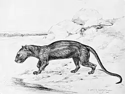 Oxyaena had a broad, low skull (20 cm long) with a long facial part and a massive lower jaw, while its body and tail were long and its five-toed limbs were short.