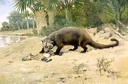 Oxyaena species were plantigrade, treading on the whole surface of their soles. For this reason, these animals could not have specialized in chasing down fast-running prey. Early studies disagreed on whether they were walking, climbing, or swimming animals; more recent work suggests that like modern raccoons, they may have been able to climb trees, swim, and make a living on the ground, but were not highly specialized in any direction.[12] An analysis of the teeth shows they were generalized feeders, like most modern raccoons and bears, rather than hypercarnivores like modern cats. The overall shape of the feeding equipment in Oxyaena was most similar to the Pleistocene bear Arctodus, which has been reconstructed as eating a range of foods similar to modern brown bears, with a preference for meat.[13] Oxyaena species had a similar size range as modern otters, so they would have hunted small to medium-sized prey, as well as eating some other foods such as insects, crustaceans, and fruit.