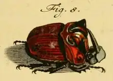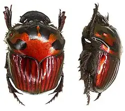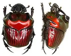 Oxysternon festivum was among the first dung beetle species studied by zoologist in the early 18th century. The first illustration of an "exceedingly beautiful shining gold and red, three horned beetle" was published in 1747 by August Johann Rösel von Rosenhof, and a first description was done by Laurens Theodorus Gronovius in 1764, but the names applied were non-binomial and therefore invalid for nomenclatural purposes.[4][5][6] It was later re-described by Carl Linnaeus under the name of Scarabaeus festivus, and was subsequently included in most publications regarding exotic insects in the late 18th and early 19th centuries.[7][8][9][10][11]