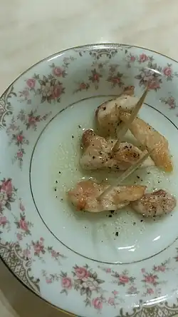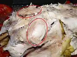 Oysters are two small, round pieces of dark meat on the back of poultry near the thigh,[1] in the hollow on the dorsal side of the ilium bone. The anatomical name of the muscle is iliotrochantericus caudalis.[2]