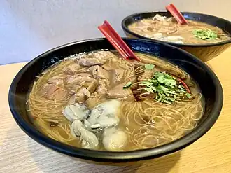 Oyster vermicelli or oyster misua (traditional Chinese: 蚵仔麵線; Taiwanese Hokkien: ô-á mī-sòaⁿ) is a kind of noodle soup originating in Taiwan.[1] Its main ingredients are oysters and misua (Chinese vermicelli). One of the famous places serving this is in Dihua Street, Dadaocheng, Taipei. A tan-brown variety of vermicelli used for this dish is made primarily with wheat flour and salt, and gains its unique colour due to a steaming process that darkens the sugars in the dough, allowing it to be cooked for longer periods without breaking down.[2]