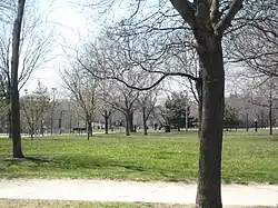 The 13.32-acre (53,900 m2) park has one walking/biking trail, which is 0.61 miles (980 m) long.[5] To go along with the Wizard of Oz theme, the park's garden is named "The Emerald Garden", and the playground is called "Dorothy's Playlot." The Emerald Garden (located at the corner of Webster and Larrabee) features flowers through which guests may walk. The Gardens are maintained by the Oz Park Advisory Council, which is a local group of volunteers. Dorothy's Playlot has swings and other climbing equipment on which children can play. While Dorothy is the main character of The Wizard of Oz, the playground is also named after Dorothy Melamerson, a retired Chicago gym teacher.[6] Melamerson, interested in children's physical well-being, donated enough money in 1994 to create an athletic field with basketball courts, an asphalt volleyball court and tennis courts. In 1996 and 1997, $600,000 of the $900,000 that Melamerson left for park upgrades and to begin youth sports programs went to renovating the Oz Park athletic field. In her honor, the field was named Melamerson Athletic Field. State Representative John Fritchey and Alderman Vi Daley gave the Oz Park Advisory Council funding for improvements to Dorothy's Playlot in 2006. In 2007, Dorothy's Playlot was covered with a rubberized material, and several pieces of play equipment were replaced.[7]