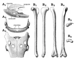 Other anatomical characteristics may have supported gliding in sharovipterygids. The holotype of Sharovipteryx does not preserve forelimbs. Both Gans and colleagues and Dyke and colleagues hypothesized that the forelimbs may have supported an additional pair of membranes, which would have served as a canard wing to improve control and balance the pitching moment of the hindlimb wings.[12][22] Dzik and Sulej noted that the structure of the scapulocoracoid in Ozimek would prevent flapping flight, and that they were at best used for gliding. They also noted that the vertebral bodies and long bones of Ozimek were hollow, but did not have external openings for air sacs that would allow air to fill them; these spaces may have been filled with fat instead, but either way they would have lightened the skeletal structure of Ozimek.[2]