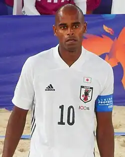 Born in Brazil, he is the captain of the Japan national team, having gained Japanese citizenship in 2012.[2] He has won the Silver and Golden Balls at FIFA World Cups[3][4] and is known as one of the best defenders in beach soccer history.[5][6] He is particularly known for his towering presence and powerful long-range free kicks.[3][7][8] In 2019, he became the first Japanese player to score over 100 international goals.[8]