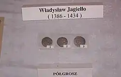 Półgrosz (półgroszek, lit. half-grosz) was a silver and later copper coin worth ½ of grosz and 9 denars, minted in Poland, Lithuania and Silesia. Polish silver półgrosz weighing 1-1,7g was minted mainly from c.1367 to 1526 and occasionally from 1580 to 1792, from 1765 coin was minted in copper. Lithuanian silver półgrosz weighing c.1,3g was minted in 1495–1566.[1]