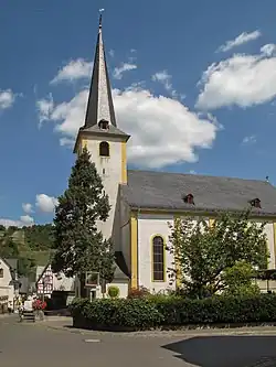 The likelihood is high that a parish had been established at Pünderich beginning in 1515. Confirming this is the church's building date, which can be reliably reckoned to be 1529. This church had a length of 59 Schuh (roughly 18.5 m) and a breadth of 43 Schuh (roughly 13.5 m). In 1766, a new church building was built on the old square by the master builder of the Springiersbach church, Paul Staehling, for 2,400 Reichsthaler; in the same year a sacristy was built onto it for 140 Reichsthaler. Only nine years later, however, the church was falling into disrepair, and building director Johann Seiz was commissioned to examine the building. He suggested replacing the vaulting, which he found to be too flat and too weak, with a wooden ceiling and improvements to the roof frame. These things were done by the following year, and the churchtower was also built higher. The church that stands today is from 1766, as shown on the lintel above the lefthand entrance door. The church's dimensions are some 25 ×11 m. The three-sided quire faces the east. The original entrance with formerly purely Gothic jambs is now glazed to make room for a spiral stairway up to the gallery. Today, entry is through two side doors in the porch.