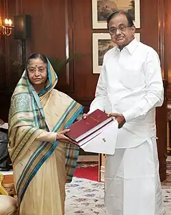 Chidambaram has served as the Union Minister of Finance four times.[5] Most recently, he held the role for the entirety of the United Progressive Alliance government from 2004 to 2014, except for a three-year period as Minister of Home Affairs, during which he oversaw India's domestic security response to the 26/11 terrorist attack in Mumbai. Chidambaram returned as Finance Minister in July 2012, succeeding Pranab Mukherjee, who resigned to become the President of India. He was included in Time 100 list in 2013.[6] He was also the head of Congress Manifesto Committee for the 2019 Lok Sabha Elections and 2024 Indian General Elections.[7][8]