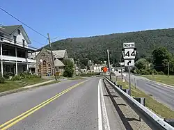 Upon splitting from PA 44, PA 144 heads east briefly before turning northeast and running through forested areas with some fields. The road winds northeast before it turns east and runs through farmland. The route heads into the community of Germania, where it passes homes and turns to the north. PA 144 runs through a mix of farms and woods and crosses into West Branch Township, curving to the northeast. The road heads into forested areas and turns to the north, running to the west of South Branch Pine Creek. Farther north, the route enters the borough of Galeton and becomes 5th Street, passing homes. PA 144 briefly jogs east at Germania Street and becomes Bridge Street, heading north across Pine Creek and passing businesses in the center of Galeton before coming to its northern terminus at an intersection with US 6.[3][6]