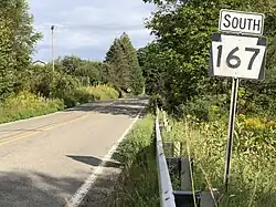 Pennsylvania Route 167 (PA 167) is a 28.7-mile-long (46.2 km) state highway located in Susquehanna County in Pennsylvania. The southern terminus is at U.S. Route 11 (US 11) in Hop Bottom. The northern terminus is at Silver Lake Road at the New York state border near Brackney.