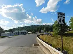 PA 44 runs through hilly areas with a mix of fields and woods, crossing into Hebron Township. The road winds north through rural areas, passing east of Greenman Hill. The route turns northwest and passes through the community of Hebron Center, continuing through wooded areas with some farm fields and residences. PA 44 reaches an intersection with the western terminus of PA 244 in the community of Coneville and turns to the west, heading to the south of Oswayo Creek. The road continues through rural areas alongside the creek and passes through the northeast corner of Clara Township before it enters Sharon Township. The route crosses the Oswayo Creek and heads through the community of Millport as it runs through more fields and woods with some development, passing through Sharon Center. PA 44 continues northwest and enters the borough of Shinglehouse, where the name becomes South Stevens Street and it runs through residential areas with some businesses, passing to the northeast of Oswayo Valley High School. The route curves north before it turns west onto Academy Street, heading past homes before passing businesses in the center of Shinglehouse and bending southwest. PA 44 heads into residential areas, turning northwest onto Oswayo Street and west-southwest onto Ceres Street. The road crosses Oswayo Creek and makes a curve to the northwest.[4][10] The route enters Ceres Township in McKean County and becomes Ceres Road, heading northwest through fields and development before running through wooded areas, with the creek to the northeast. The road continues through a mix of farm fields and wooded areas with some development, passing through the community of Myrtle. Farther northwest, PA 44 reaches the community of Ceres and crosses the Oswayo Creek before coming to its northern terminus at the New York border. From here, the road continues north for less than 100 yards (91 m) to a T-intersection with NY 417.[4][12]