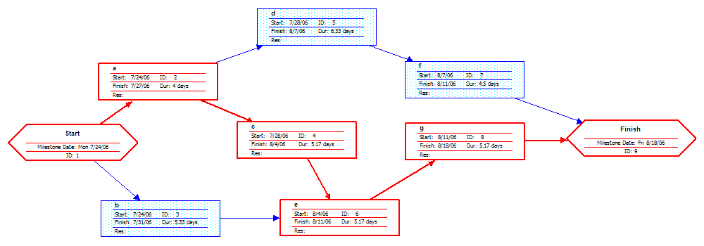 By itself, the network diagram pictured above does not give much more information than a Gantt chart; however, it can be expanded to display more information. The most common information shown is: