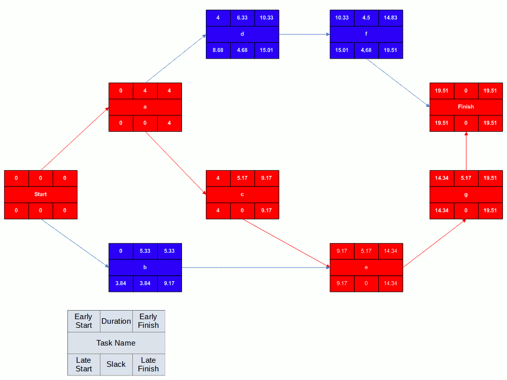 • The ES for finish is the greatest EF of its predecessor activities (f and g). Since f has an EF of 14.83 and g has an EF of 19.51, the ES of finish is 19.51. Finish is a milestone (and therefore has a duration of zero), so the EF is also 19.51.