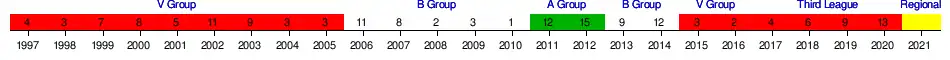 Kaliakra was relegated to the B PFG after two years in the top division. After two more years in B PFG Kaliakra was relegated back to the amateur divisions, ending nearly a decade of professional football.