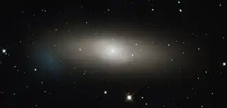 NGC 1023, also known as the Perseus Lenticular Galaxy,[3] is a barred lenticular galaxy, a member of the NGC 1023 group of galaxies in the Local Supercluster. Distance measurements vary from 9.3 to 19.7 million parsecs (30 to 64 million light-years).[1] The supermassive black hole at the core has a mass of (4.4±0.5)×107 M☉.[4] The black hole was discovered by analyzing the dynamics of the galaxy.[5]