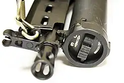 The magazine serves as the lower handguard and the current models of the magazine are ribbed to enhance grip. The Bizon also uses the same trigger and safety mechanisms as the AK-74 rifle.[8][5] The selector lever is placed on the right side of the receiver, above the trigger, and has three settings: the uppermost "safe" setting disables the trigger and in this position the lever physically blocks the bolt's integral retracting handle; the middle position (marked "АВ") enables fully automatic fire and the lowest position ("ОД") will activate the semi-automatic function of the trigger.[8] An original five-piece anti-bounce device is built into the trigger unit and this functions as a rate reducer, delaying firing until the bolt has settled entirely into battery.[1]