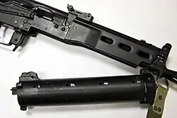 The Bizon also utilizes the AKS-74 side folding stock.[1] It folds to the left side of the receiver but unlike the AKS-74 and AKS-74U, it is not held closed by a spring-loaded capture in the forward end of the receiver. Instead, it is held closed by the forward trunnion pin which is longer on the Bizon than on its AKS-74 predecessors. The extended length of the pin allows it to catch the folding skeleton stock. The pistol grip is identical to the grip on the AK-100 series and is made of a black fiberglass-reinforced polyamide.[1]