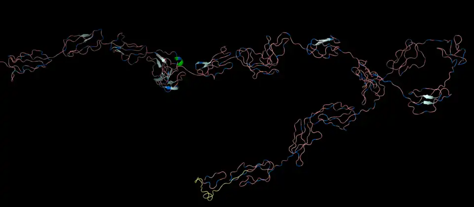 Predicted secondary structures for PROB1 reveal that the protein is mostly composed of random coils, with a small percentage of alpha helices and beta sheets present.[13] This is likely due to the properties of proline; its large size, ring structure, and confined phi angle cause it to disrupt secondary structure formation. The DUF, which resides in the second proline-rich region of the protein, is also predicted to be completely composed of random coils. A tertiary structure prediction for PROB1 was generated using I-Tasser[11] and rendered in PyMOL;[12] overall, the protein displays an elongated structure.