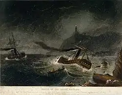 The Queen Victoria left Liverpool on the night of 14 February 1853 with cargo and approximately 100 passengers. As it approached the Irish coast at Howth it was hit by a snowstorm. It struck Howth Head around 2:00am on 15 February. The Captain backed the ship away from the Head in hopes of being able to navigate into the harbour. The damage to the ship was more extensive than the captain thought and it quickly began to fill with water. It drifted, dead in the water, and struck below the Baily Lighthouse. It sank within 15 minutes of the second hit, 100 yards south of the lighthouse. Approximately 83 passengers and crew perished, including the Captain. One lifeboat, with 17 passengers, made it to shore.[1]