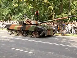 The PT-91 Twardy (Polish pronunciation: [ˈtfar.dɨ], English: Hard) is a Polish main battle tank. A development of the T-72M1, it entered service in 1995. The PT-91 was designed at the OBRUM (Ośrodek Badawczo-Rozwojowy Urządzeń Mechanicznych, or Research and Development Centre for Mechanical Appliances) and is produced by the Bumar Łabędy company,[6] part of the Bumar Group,[7] a Polish technical military consortium. Changes from the T-72M include a new dual-axis stabilized fire-control system, reactive armour, a more powerful engine, transmission and new automatic loader.