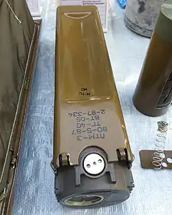 The PTM-3 (Russian: ПТМ-3: ПротивоТанковая Мина-3) is a Soviet scatterable self-liquidating shaped charge anti-tank mine.[1][2] The mine's case is made up of a stamped steel body with notches in its side. The notches allow the mine to produce a shaped charge effect on five sides - 4 on the sides, and one on the end face.[3] The mine has two arming stages - pyrotechnic and mechanical, and has a magnetic influence battery-powered fuze BT-06 (Russian: БТ-06).[1][2][3] The mine can be delivered using the BM-30 Smerch (9M55K4), BM-27 Uragan (9M59), BM-21 Grad (9M22K) MLRS,[2] helicopter-mounted minelaying system VSM-1, remote mining machine UMZ (Russian: УМЗ) or portable mining kit PKM (Russian: ПКМ: Переносной Комплект Минирования).[3] It cannot be placed manually, and must only be placed using remote minelaying systems listed above.[1] The mine was introduced in 1951.[4]