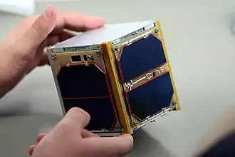 PW-Sat is a series of Polish CubeSats designed and built by students at the Warsaw University of Technology in conjunction with the Faculty of Power and Aeronautical Engineering of Warsaw University of Technology, the Space Research Centre of Polish Academy of Sciences, and the European Space Agency. As of January 1, 2024, there have been 2 PW-Sats with a third in development. The first PW-Sat was the first Polish artificial satellite[1] which was launched 13 February 2012 from ELA-1 at Guiana Space Centre aboard Italian-built Vega launch vehicle during its maiden voyage.[2] After their graduation, the team that developed the original PW-Sat have also worked to develop the subsequent missions, establishing a private company named PW-Sat to design and manufacturer the PW-Sats, all of which test novel deorbiting methods, with the overall goal of the program to develop solutions to space debris.[3][2]