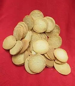 Paborita are Filipino disc-shaped biscuits with a flaky texture. They are made with wheat flour, sugar, skim milk, salt, baking powder, alum, and cooking oil. They are very similar in taste to galletas de patatas. They are traditionally eaten paired with hot drinks or with fruit preserves.[1][2][3][4][5]