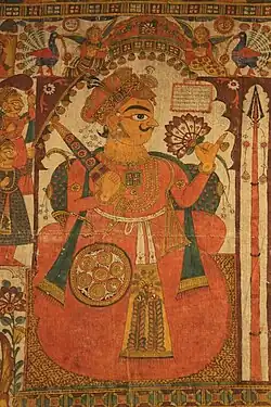 The Phad or Par represents, in its painting, the court of Pabuji (as a historical true Rajput chief who sacrifices his life for protection of others), his palace and his divine character as an incarnation of Laksmana, brother of the Rama of the Ramayana Hindu epic story, the forts in which he lived as well as the sanctum of his goddess Deval. The backdrop of such narrations is invariably in the desert villages of Rajasthan. The images in the painting are arranged logically, also showing revengeful exploits of his nephew on his enemy, Jindrav Khici. However, iconographically it is considered as "extremely complex and intricate."[3][5][12]