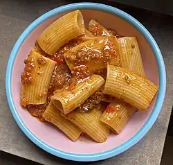 Paccheri (Italian: [ˈpakkeri]) is a type of pasta in the shape of a very large tube, originating from the Campania region of Italy. They are generally smooth, but there is also a ribbed version, paccheri millerighe. The name comes from Neapolitan paccharia, 'slaps', with a depreciative -ero to indicate something common.[2] The name has been ascribed to a slapping sound they may make when eaten. They can be served stuffed, and are commonly prepared with beans, or with ricotta and tomato sauce in Campania. As they are eaten, they split open, forming a flat sheet. In the late 1990s, food writer Arthur Schwartz described paccharia as the most popular large tube pasta in Campania.[3]