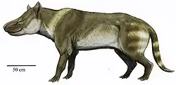 Pachyaena (literally, "thick hyena") was a genus of heavily built, relatively short-legged mesonychids, early Cenozoic mammals that evolved before the origin of either modern hoofed animals or carnivores, and combined characteristics similar to both. The genus likely originated from Asia and spread to Europe, and from there to North America across a land bridge in what is now the North Atlantic ocean.[1] Various described species of Pachyaena ranged in size from a coyote to a bear. However, a 2007 paper suggests that Pachyaena may be paraphyletic, with P. ossifraga being closer to Synoplotherium, Harpagolestes and Mesonyx than to P. gigantea.[2]