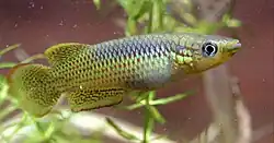 Pachypanchax playfairii, the golden panchax, is a species of Aplocheilid killifish, the only species of freshwater fish endemic to the Seychelles, a group of islands in the Indian Ocean, east of Tanzania. It is the only member of its genus found outside of Madagascar. Within the Seychelles it is found only on the granitic islands.[1] Here it occurs in small freshwater and brackish water streams, feeding on worms, crustaceans, insects and fish.[3] An egg scatterer, the golden panchax breeds amongst floating water plants. This species is unusual in that the scales of the male become lifted during the breeding season, giving the skin a rough appearance. Unlike the true annual killifish, they live as long as similar fishes, a few years, 3 years is not uncommon 5 is unknown.