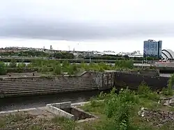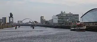 Pacific Quay is an area south of the River Clyde in Glasgow, Scotland. It is located at the former Plantation Quay and Princes' Dock Basin.[1] The Princes' Dock Basin was the largest on the River Clyde when it was opened by the Clyde Navigation Trust in 1900. It ceased to be used as a commercial dock by the Clyde Port Authority in the 1970s as the volume of shipping using the Upper Clyde declined with the onset of containerization. The site was later used for the Glasgow Garden Festival in 1988. The former electric generating station and pumping house, "Four Winds" which was used to pump water between the rotundas and generate power for the electric cranes still stands and is now home to a consultant engineers and radio station. The name 'Pacific Quay' has no historical significance, as it was created simply as a marketing enterprise following the land being reclaimed for commercial use after the Garden Festival closure. It did not reflect the site as a departure point for ships bound for the Pacific Rim.