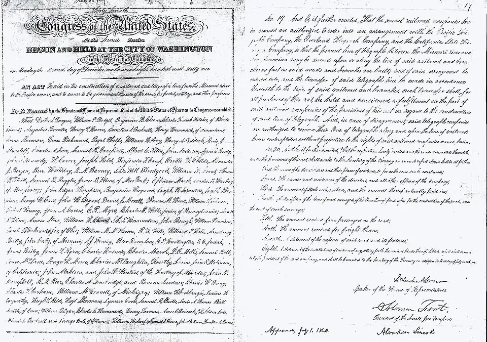 First and last pages of the original manuscript of the Pacific Railroad Act of 1862 (12 Stat. 489) signed by President Lincoln on July 1, 1862 (U.S. National Archives)