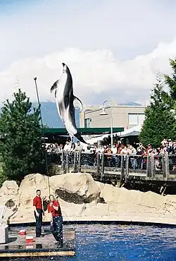 Although overshadowed in popularity by bottlenose dolphins, Pacific white-sided dolphins are also a part of some marine theme park shows. Roughly 100 reside in dolphinaria in North America and Japan. In captivity, they tend to consume less amounts of food when compared to their wild counterparts, this could be the case due to the fact of temperatures changing in the water based on the seasons. However, the condition in which the dolphins lives, most likely in an aquarium tank, will impact how much energy is required for a captive dolphin to thrive in captivity. Studies have also shown that the highest amount of food intake that a captive Pacific white-sided dolphin displays in autumn when the dolphin increase their food intake as well as their body mass.[27][28]