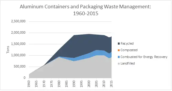 Aluminum container and packaging waste usually comes from cans from any kind of beverages, but foil can also be another that contributes it as well. It has been given that about 25 percent of aluminum is used for packaging purposes.[14] Using the Aluminum Association Data, it has been calculated that at least 1.8 million tons of aluminum packaging were generated in 2015 or 0.8 percent MSW produced.[5] Of those that are produced, only about 670,000 tons of aluminum containers and packaging were recycled, about 54.9 percent.[5] And, the ones that ends up in the land fill is 50.6 percent.[5]