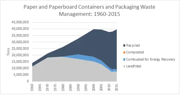 Later on, they are then combusted which makes 0.5 million tons and landfills received 1.9 million tons.[5] Other than corrugated boxes, cartons, bags, sacks, wrapping papers, and other boxes used for shoes or cosmetics are other examples of paper and paperboard containers and packaging. The total amount of MSW generated for paper and paperboard containers and packaging was 39.9 million tons or 15.1 percent in 2015. Although, the recycled rate is about 78.2 percent and 4.3 percent of small proportions were combusted with energy recovery and 17.6 percent in landfill.
