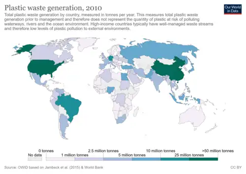 - ^ a b c d e f g h i j k l m n o p q r s t u v Ritchie, Hannah; Roser, Max (September 1, 2018). "Plastic Pollution". Our World in Data. Retrieved October 29, 2019.