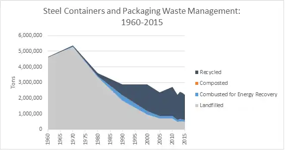 The production of steel containers and packaging mostly comes in cans and other things like steel barrels. Only about 5 percent of steel use for packaging purposes of the total world of steel consumption which makes it the least amount wasted and the most recycled.[14] It has totaled that 2.2 million tons or 0.9 percent of MSW generated in 2015.[14] While according to the Steel Recycling Institute, an estimate of 1.6 million tons (73 percent) of steel packaging were recycled.[14] Adding on, the steel packaging that were combusted with energy recover was about 5.4 percent and 21.6 percent were land filled.[5]