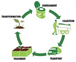 Container-based sanitation (abbreviated as CBS) refers to a sanitation system where toilets collect human excreta in sealable, removable containers (also called cartridges) that are transported to treatment facilities.[1] This type of sanitation involves a commercial service which provides certain types of portable toilets, and delivers empty containers when picking up full ones. The service transports and safely disposes of or reuses collected excreta. The cost of collection of excreta is usually borne by the users. With suitable development, support and functioning partnerships, CBS can be used to provide low-income urban populations with safe collection, transport and treatment of excrement at a lower cost than installing and maintaining sewers.[2] In most cases, CBS is based on the use of urine-diverting dry toilets.