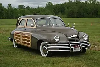 The Station Sedan used a combination of steel framing and body parts along with structural wood panels made from northern birch to create a "woody" station wagon-like car due to the growing popularity of them after World War II. Unlike other woody wagons of the day, which used wooden passenger compartments mounted to chassis of a particular car, the Station Sedan used a steel subframe and steel passenger doors onto which hard wood panels were mounted. The only wooden door on the vehicle was the rear gate assembly.[3] Unlike competitor station wagons from Buick, Chrysler and Mercury, the Packard's length was not long enough to accommodate optional third row seating.[3]