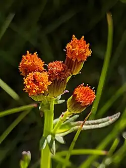 It is a perennial herb producing one or more erect stems up to half a meter tall from a thick caudex and fibrous root system. The basal leaves have thick, toothed blades up to 4 centimeters long, and those higher on the stem have smaller, more dissected leaves. The inflorescence bears a single flower head or an umbel-shaped array of up to 6 heads. Each head has green to reddish or purplish phyllaries, many disc florets, and often several ray florets. The florets may be most any shade of red, orange, or yellow. The specific epithet pauciflora is Latin for 'few-flowered'.[2][3]