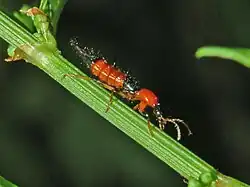 They can secrete by abdominal glands an urticant substance.[5] Larvae and adults are predators of small insects.