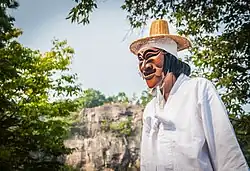 ![]() A masked person acting as a paekchŏng butcher in a play | |