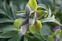 One or very rarely two hermaphrodite flowers fully develop on each stem, while one or two flowerbuds are arrested in their development, and two to five leaflike bracts are present. The flowers are somewhat nodding. Each flower has three to five leathery sepals that mostly end in a stretched tip, making it "leafy", but sometimes one and rarely two sepals may be obovate with a rounded tip, which do not fall after flowering. The corolla usually consists of six to nine oblong cyclamen or rarely pink to white petals of 3–6½ × 1½–3 cm. Towards the centre of the flower are many stamens consisting of filaments of ½–1 cm topped with anthers that ripen from the inside out, open with slits and release yellow pollen. The pollen is released in sets of four grains together. Dependent on latitude and altitude flowers open between April and July and are said to smell like lily of the valley. Petals and stamens are shed after flowering. The two to five carpels are initially pale yellow with reddish stigmas, but eventually become green, may be hairless or covered in soft felty hairs. Within, several large, initially red but eventually shiny black seeds of 6×4 mm develop, and each carpel opens by a slit over the entire length. Ripe seedheads may be present during August and September.[2][4][5][6][7]