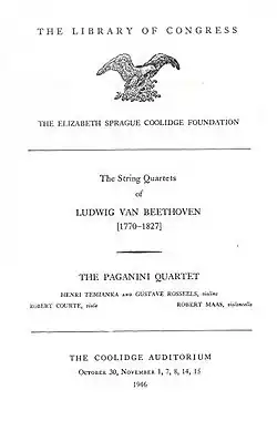 In 1945, Maas, who had been with the Pro Arte Quartet until early in World War II and was interested in forming a new string quartet, secured a sponsorship from Anna Clark, the widow of copper millionaire William A. Clark.[3] Maas happened upon four Paganini Strads at the shop of Emil Herrmann in New York, and mentioned them to Mrs. Clark, who promptly purchased the instruments for the quartet's use. Meanwhile, another patron of chamber music, Elizabeth Sprague Coolidge, had sponsored violinist Henri Temianka's performance of the Beethoven violin sonata cycle at the Library of Congress in Washington, D.C., with pianist Leonard Shure, and she also expressed interest in the project. Gustave Rosseels, violin, and Robert Courte, viola, immediately accepted invitations to complete the ensemble. As detailed by authors Bill Dedman and Paul Clark Newell, Jr. in Empty Mansions, the story of the Clark family, the quartet often performed and practiced at the Clark home in Santa Barbara, Bellosguardo.[4]