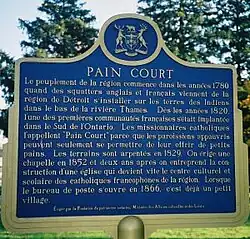 By the 1820s in the nearby "Pain Court Block", one of the earliest French-speaking (Franco-Ontarian) communities in southern Ontario had developed. Named Pain Court (literally meaning "short bread") by Catholic missionaries in reference to the small loaves of bread which was all the impoverished parishioners could offer, the settlement was surveyed in 1829. In 1852 a chapel was built and two years later construction of a church commenced. It quickly became the cultural and educational centre of French-speaking Catholics in the area. By 1866 when a post office was established, a small village had developed.[2]