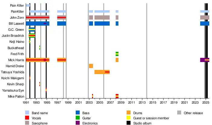 The three primary members of Painkiller were John Zorn on saxophone, Bill Laswell on bass guitar and Mick Harris on drums. Zorn and Laswell work in the New York avant-garde jazz music scene. Harris was the drummer for the grindcore band Napalm Death.[3] Harris' blast beats inspired Zorn to create his signature style, forming improvisational groups like Naked City that merged disparate genres into a unique scene.[4] Several musicians have made guest appearances both live and in the studio, including Buckethead, Kevin Sharp of Brutal Truth, Yamatsuka Eye, Mike Patton, Koichi Makigami of Hikashu, Justin Broadrick and G. C. Green of Godflesh, Fred Frith, and Keiji Haino of Fushitsusha.