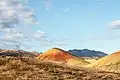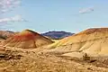 The Painted Hills is a geologic site in Wheeler County, Oregon that is one of the three units of the John Day Fossil Beds National Monument along with Sheep Rock and Clarno. It totals 3,132 acres (12.67 km2) and is located 9 miles (14 km) northwest of Mitchell, Oregon. The Painted Hills are listed as one of the Seven Wonders of Oregon.[1] The layers of color for which the site is named can be traced back to cycling periods of wet and dry climate conditions associated with the transition from the Eocene epoch to the cooler, more temperate Oligocene epoch.[2][3] The different layers of colors are due to the soil being composed of a combination of mudstone, siltstone, shale and lignite.