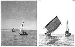 Pajala is an undecked coasting boat which usually has a tripod mast carrying a single large tanja sail. It is carvel-built, and like other Austronesian boat, it is a double ender (the bow and stern of the boat is sharp, i.e. having stem and sternpost).[2]: 22–23 The bow and stern were similar in shape, usually turn sharply because the board is cut, not bent, into shapes. The pattern of the planks indicates that it was no different from traditional boats from 1000 years ago. The first plank is longer than the keel. The plank is arranged from corner to corner with internal dowels. While mainly deckless, there is a low deck abaft the stempost, behind it is a place for washing.[3] It is built using smooth curved planks, with double quarter rudders, used as a frame and the ribs are placed thereafter.[1]